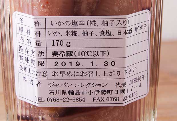 原材料は…いか、米糀、柚子、食塩、日本酒、唐辛子です。