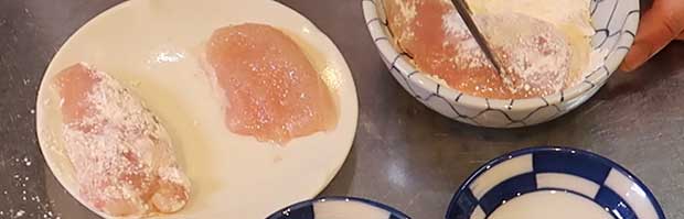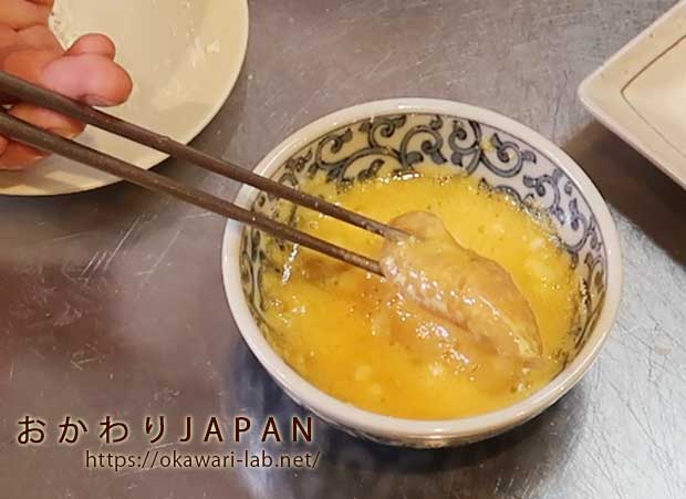 <3>:<1>のむね肉にを<2>の溶き卵をまんべんなくつける。
