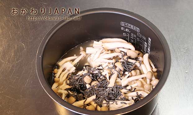 <1>油揚げ・しめじをお好み大きさに切る。 炊飯器に材料を入れて、スイッチを押すだけ!