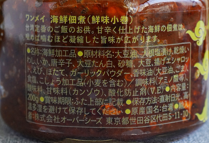 大豆油、大根塩漬け、乾燥いわし、いか、唐辛子、大豆たん白、砂糖、大豆、揚げエシャロット、えび、ほたて、ガーリックパウダー、香味油(大豆油、ごま)、食塩、こしょう加工品(小麦を含む)/調味料(アミノ酸等)、酸味料、甘味料(カンゾウ)、酸化防止剤(V.E)