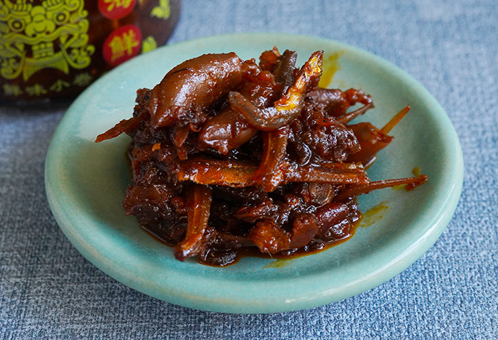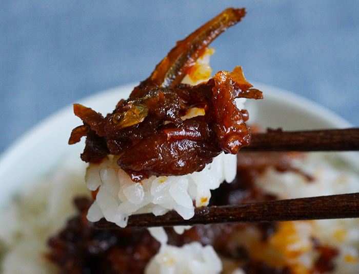 ホタルイカや小イワシ、小エビなどの海鮮を甘辛く仕上げた少しピリ辛の佃煮で、