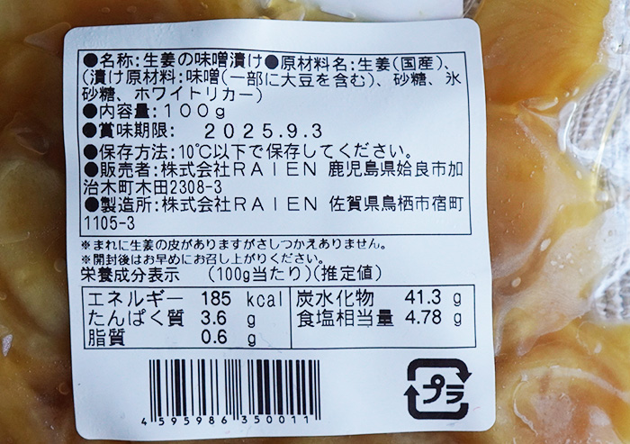原材料は…生姜(国産)、(漬け原材料:味噌(一部に大豆を含む)、砂糖、氷砂糖、ホワイトリカー)です。