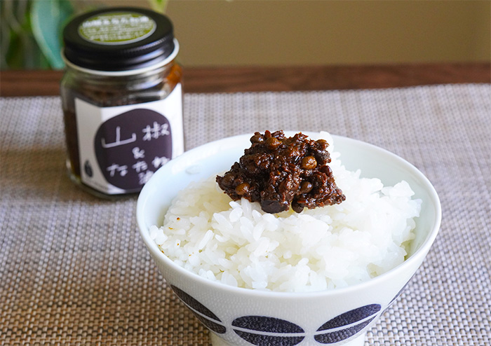 ピリッと辛い山椒と一番しぼりのなたね油、酵素や酵母の入った醤油のもろみを合わせた発酵調味料です。