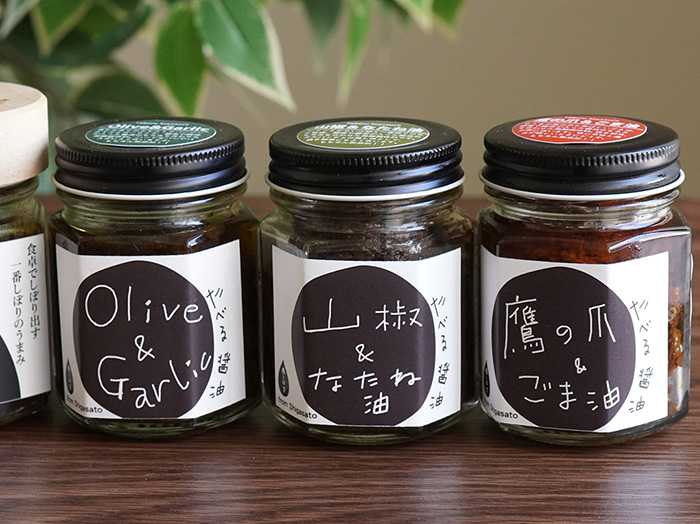 (株)今しぼりの食べる醤油シリーズは、今回ご紹介した「山椒&なたね油」のほかに、「オリーブ&ガーリック」、「鷹の爪&ごま油」の全3種類。