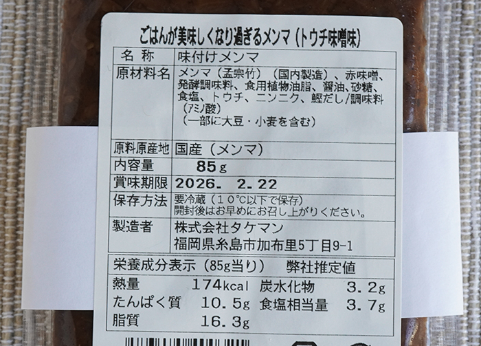 原材料は…メンマ(孟宗竹)(国内製造)、赤味噌、発酵調味料、食用植物油脂、醤油、砂糖、食塩、トウチ、ニンニク、鰹だし/調味料(アミノ酸)(一部に大豆・小麦を含む)です。