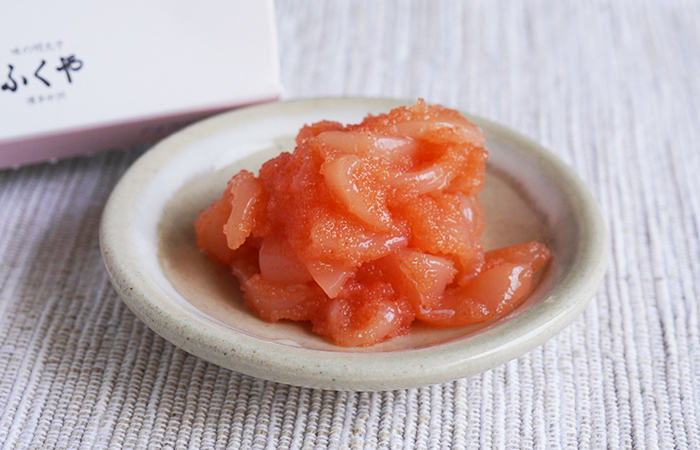 ふくやならではの、ほんのりピリ辛な明太子の粒をたっぷりとまとった、柔らかくて甘いいか。