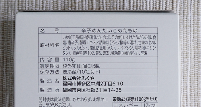 原材料は…いか加工品(国内製造(いか、食塩、その他))、すけとうだらの卵、食塩、唐辛子、酵母エキス/調味料(アミノ酸等)、酒精、甘味料(ソルビット)、ソルビット、酸化防止剤(V.C)、ナイアシン、増粘剤(キサンタン)、着色料(赤102、黄5、赤3)、発色剤(亜硝酸Na)、酵素 です。