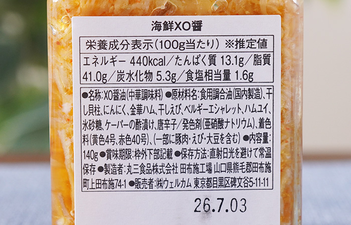 食用調合油(国内製造)、干し貝柱、にんにく、金華ハム、干しえび、ベルギーエシャレット、ハムユイ、氷砂糖、ケーパーの酢漬け、唐辛子/発色剤(亜硝酸ナトリウム)、着色料(黄色4号、赤色40号)、(一部に豚肉・えび・大豆を含む)