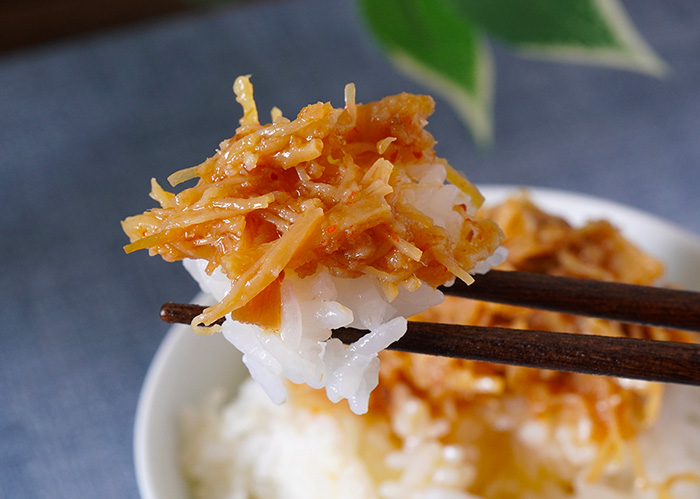 ただ……正直なところ、「ご飯にのせて食べる」となると、もうちょっと味のパンチが欲しかった! 塩味なのか、にんにくなのか、あるいは辛味なのか。 普段、味のしっかりした瓶詰ご飯のお供ばかり食べている私には、少し物足りなく感じてしまいました。
