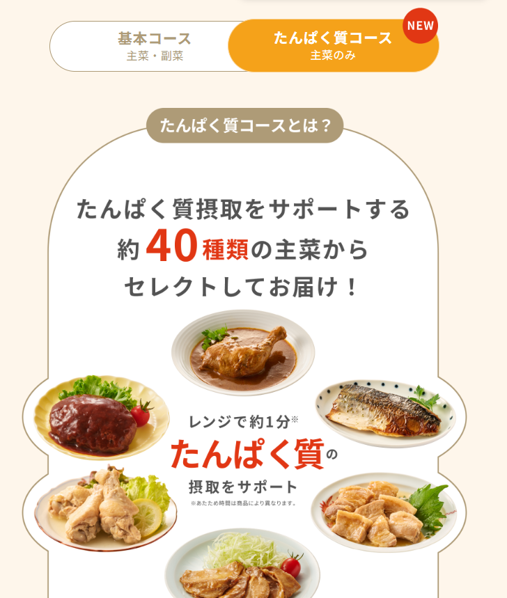 - メニュー内容: 高たんぱく質な主菜(肉・魚)約40種類に特化しており、副菜は含まれません。